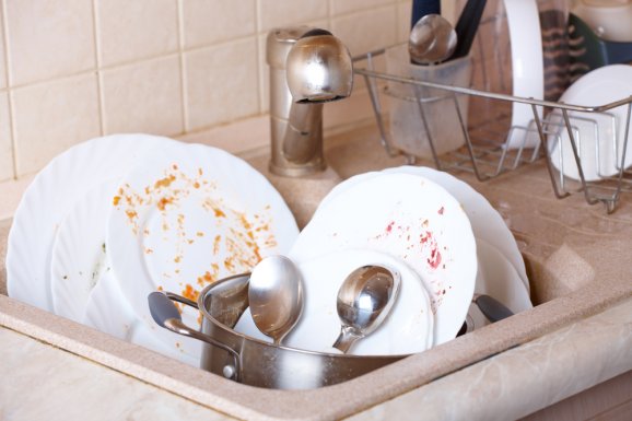 Při mytí nádobí v napuštěném dřezu dbejte na dostatečně teplou a čistou vodu / Depositphotos