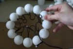 Nejprve si do všech míčků předvrtejte díry velké tak, aby se do něj dalo snadno prostrčit světýlko led řetězu. Pokud už vám zvuk vrtačky poleze na nervy, na chvíli toho nechejte a děrované míčky si seskládejte do kruhu po dvanácti. Použijte přitom nějakou kulatou podložku, aby se vám kruh dobře tvaroval. Vyvrtané otvory směřují dovnitř kruhu. Míčky pak slepte k sobě pomocí tavné pistole. Jakmile máte kroužek hotový, vyrobte si postupně další a další. A nezapomeňte do nich navrtat i ty díry. Až budete mít potřebný počet kroužků, vezměte si světelný řetěz a začněte sestavovat lampu.